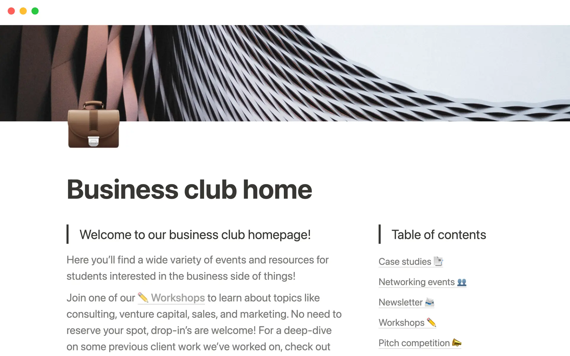 For consulting, entrepreneurship, or marketing clubs, it's all about gaining credibility by showing off the case studies you've worked on previously. Keeping those updated and presenting them in an elegant way can make or break whether you get that next client. In Notion, you can use subpages and simple columns to format text and images cleanly. Then, when you need a refresh, just edit directly in the page.